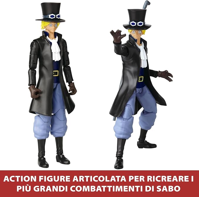 Salpa con i tuoi pirati preferiti: Sabo, fratello di Ace e Rufy e capo di stato maggiore dell’esercito rivoluzionario. È riconosciuto come il numero 2 dell’intera organizzazione, venendo subito dopo Dragon in termini di comando. Ha mangiato il Mera-Mera no Mi (il frutto del diavolo originariamente appartenuto ad Ace), Sabo è in grado di sparare potenti esplosioni pirocinetiche. La figura è dotata di 2 set di mani intercambiabili, accessori specifici per il personaggio e oltre 20 punti di articolazione per posare e giocare in infiniti modi.