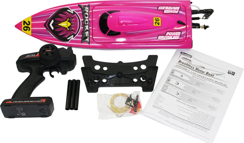 Modello RC verniciato e assemblato finito della barca Rocket Brushless V2 con motore AC raffreddato ad acqua installato, controller AC raffreddato ad acqua da 30 A con connettore XT60, servo MG da 9 g impermeabile e ricevitore J2C91R 2.4H a 4 canali per ricevitore, connettore XT60 per batteria con tubo termoretraibile , chiavi a brugola da 2 mm e 2,5 mm, nastro adesivo, velcro per batteria, elastici in muschio, trasmettitore Joysway 2,4 GHz FHSS, supporto e manuale.